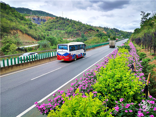 仲夏時(shí)節(jié),昆磨高速普洱至景洪段的羊蹄甲、紫薇、火把花等植物百花齊放,大風(fēng)埡口隧道口姹紫嫣紅的三角梅,寧洱收費(fèi)站立交粉嫩養(yǎng)眼的金絲桃,高速中央隔離帶嬌艷欲滴的木槿,在幾場(chǎng)雨水的洗禮和管理處的精心養(yǎng)護(hù)下,變得生機(jī)盎然。昆磨高速普洱管理處轄區(qū)管養(yǎng)路段植被豐富,公路蜿蜒穿梭在青山綠水間,共設(shè)有5個(gè)立交苗圃基地示范區(qū),以開(kāi)花喬木為主,地被為輔,四季開(kāi)花,豐富了植物層次,一立交一風(fēng)景,樹(shù)綠花紅的景象與高速公路融為一體交相輝映。