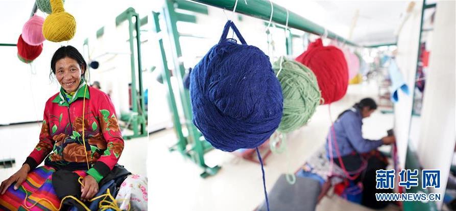 拼版照片:左圖為西藏阿里地區(qū)改則縣物瑪鄉(xiāng)村民央卓在噶爾縣康樂新居服裝地毯加工廠;右圖為央卓在噶爾縣康樂新居服裝地毯加工廠工作。2017年,央卓和家人從改則縣物瑪鄉(xiāng)搬遷到噶爾縣康樂新居易地扶貧搬遷安置點(diǎn),住進(jìn)了125平方米的新居。2018年7月,央卓和女兒參加了康樂新居服裝地毯加工廠的培訓(xùn),在家門口找到了工作(7月25日攝)。 新華社記者 詹彥 攝