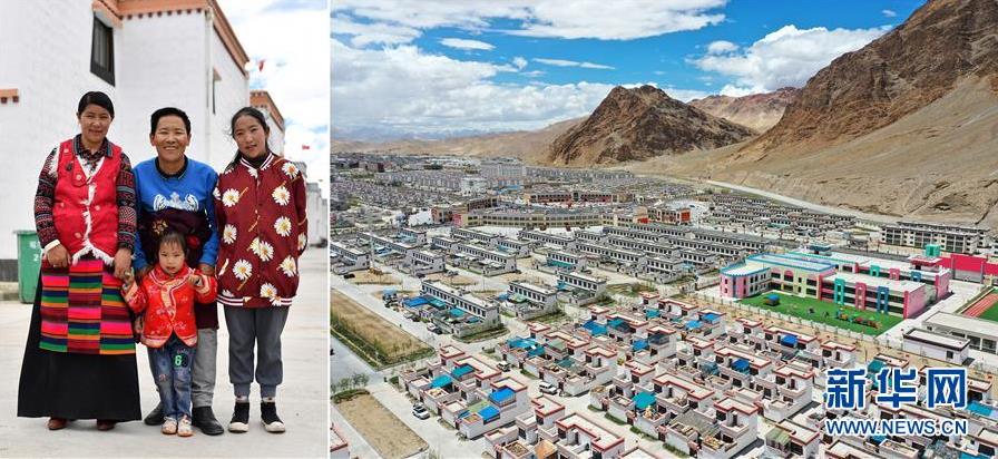 拼版照片:左圖為西藏阿里地區(qū)日土縣東汝鄉(xiāng)阿汝村村民丹木真(中)和妻子扎西拉姆(左)、女兒南嘎曲增(右)、小女兒列旺桑姆在噶爾縣康樂新居易地扶貧搬遷安置點(diǎn);右圖為噶爾縣康樂新居易地扶貧搬遷安置點(diǎn)一角(無人機(jī)照片)。2018年,丹木真和家人搬遷到噶爾縣康樂新居易地扶貧搬遷安置點(diǎn),告別了村里土木結(jié)構(gòu)的舊房子,住進(jìn)了150平方米的新居。安置點(diǎn)內(nèi)醫(yī)務(wù)室、幼兒園、活動中心等設(shè)施齊全,和丹木真一家一樣,從阿里地區(qū)改則縣、措勤縣、革吉縣等地搬遷來的2000多名群眾在這里過上了安居樂業(yè)的幸福生活(7月25日攝)。 新華社記者 詹彥 攝