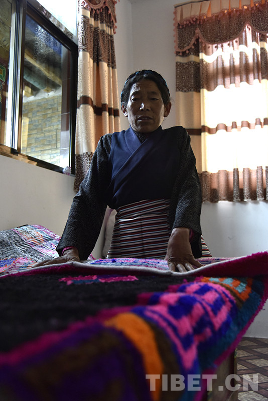 學(xué)會(huì)了縫紉制衣,次仁宗巴也漸漸摸透了氆氌、卡墊編織的竅門。為了獲得編織氆氌和卡墊的羊毛線,腿腳不便的次仁宗巴帶著自家核桃樹結(jié)的核桃,前往措美縣與當(dāng)?shù)啬撩窠粨Q羊毛線。羊毛線的品質(zhì)好,自己又肯鉆研,次仁宗巴自制的氆氌、卡墊也受到大家的歡迎,一年能賣上千元。
