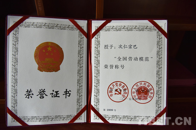 圖為次仁宗巴2015年獲得的“全國(guó)勞動(dòng)模范”榮譽(yù)稱號(hào)證書 攝影:王媛媛