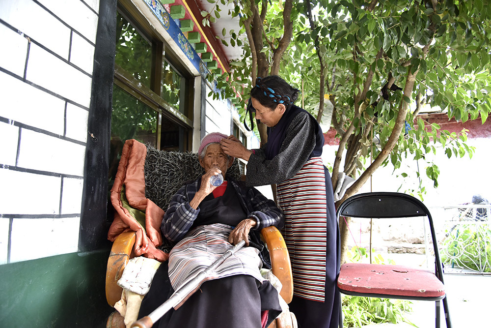 圖為次仁宗巴在照看母親索朗卓瑪喝水 攝影:王媛媛