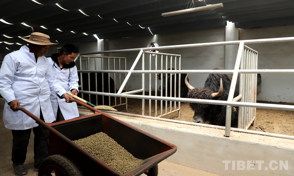中國西藏網(wǎng)訊 一鏟鏟飼料倒到食槽內(nèi),牦牛悠閑地慢慢咀嚼。中午時(shí)分,西藏自治區(qū)昌都市類烏齊縣濱達(dá)鄉(xiāng)央宗村的向巴郎加和幾位村民正在當(dāng)?shù)氐年笈6唐谟适痉痘貎?nèi)飼喂近期將要出欄的牦牛。