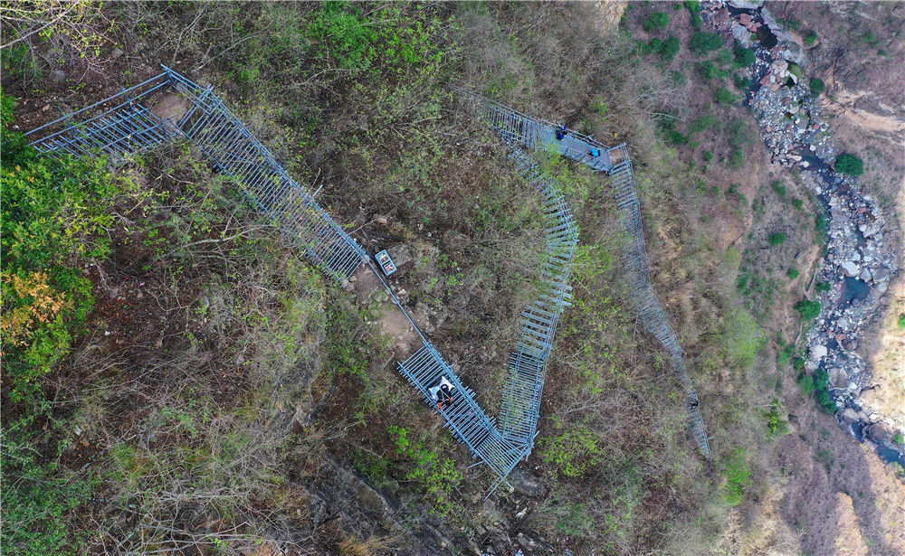 在四川涼山彝族自治州昭覺縣阿土列爾村的懸崖鋼梯上,“懸崖村”村民沿著鋼梯下山(5月13日攝,無人機(jī)照片)。新華社記者 王曦 攝