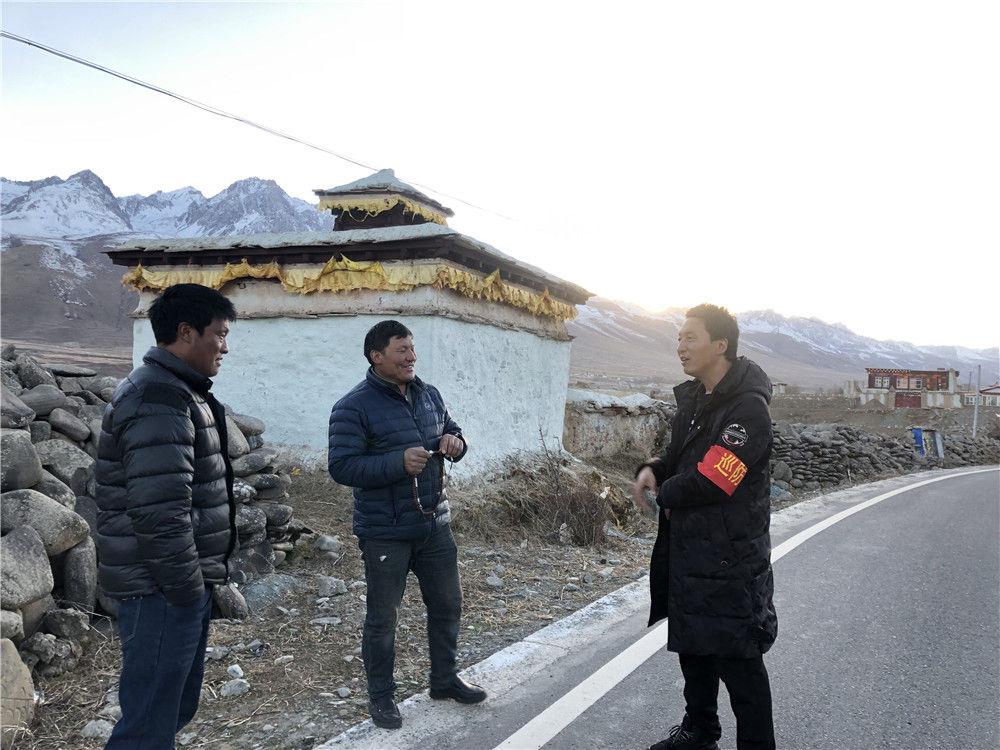 生前擔(dān)任甘孜州甘孜縣夏拉卡村駐村第一書記的馬伍薩(右)在巡防路上和村民交流(資料照片)。新華社發(fā)