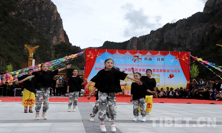 圖為昌都市崗?fù)墟?zhèn)小學(xué)生在豐收節(jié)表演舞蹈