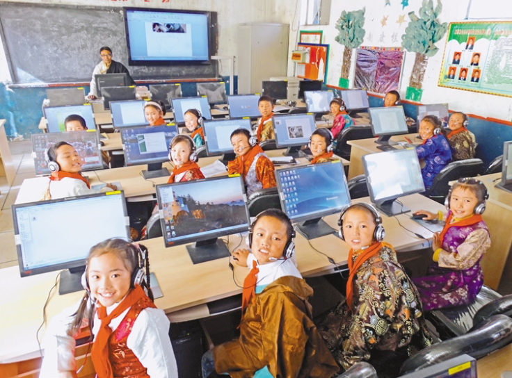 圖為西藏自治區(qū)日喀則市南木林縣完全小學(xué)的學(xué)生在上計(jì)算機(jī)課 攝影:楚武干