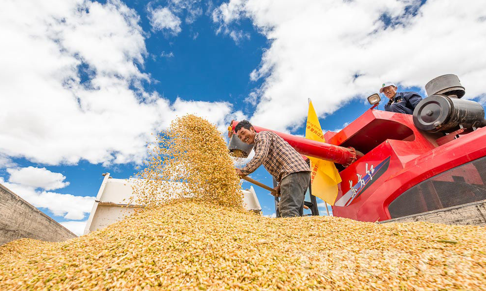 圖為日喀則市江孜縣紫金鄉(xiāng)努堆村的機(jī)械化秋收 攝影:趙耀