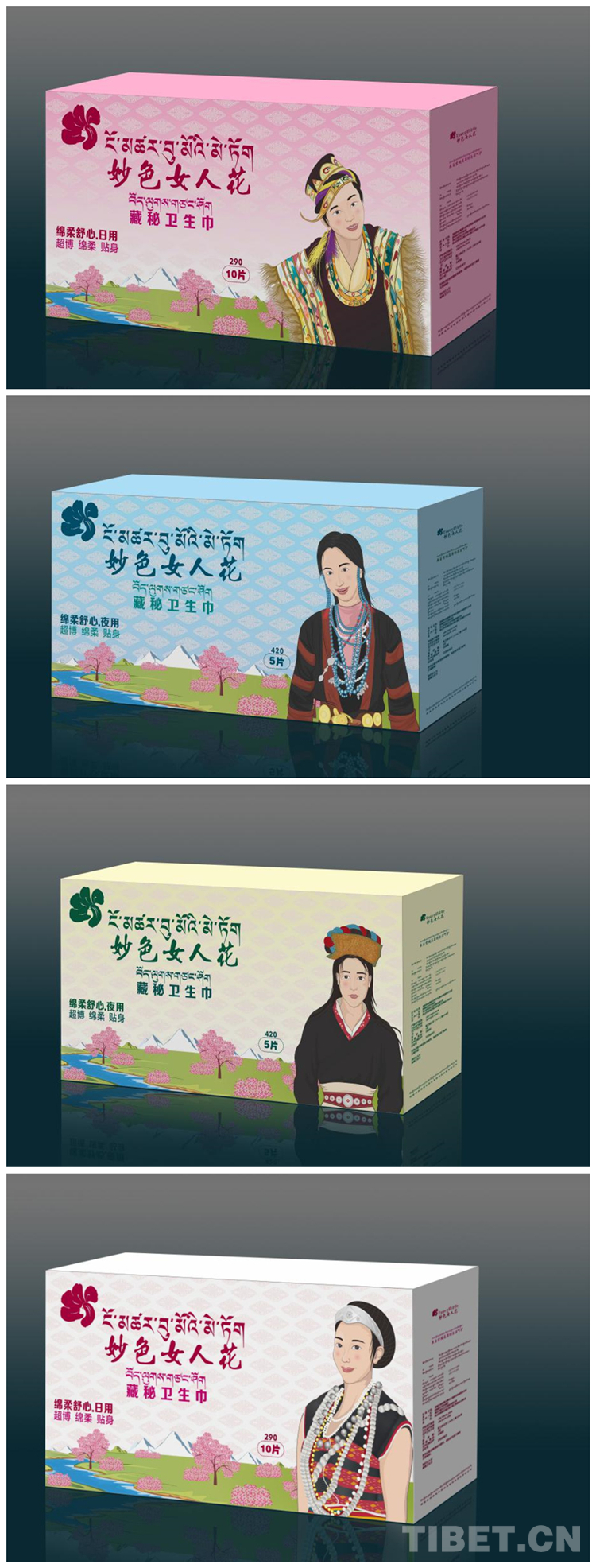 產(chǎn)品的包裝設(shè)計歷經(jīng)4個版本,拉巴次仁最終選定了身著傳統(tǒng)服飾的工布藏族、珞巴族、門巴族、僜人女性漫畫形象,他認(rèn)為這樣最能代表林芝女性的風(fēng)采。