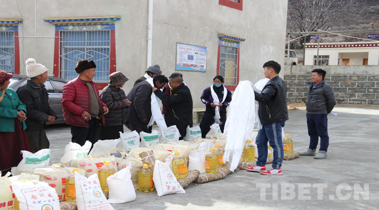 圖為拉巴次仁帶著公司成員一起到米林縣里龍鄉(xiāng)看望貧困戶
