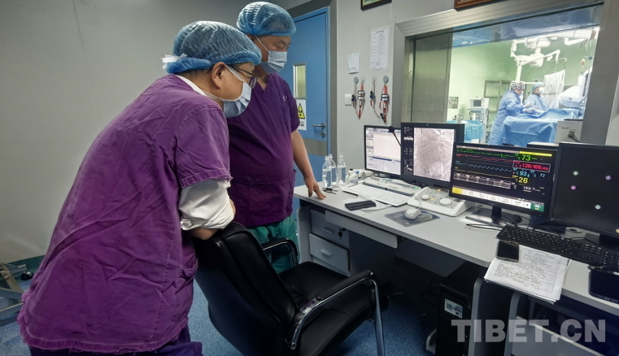 圖為陰赪茜(手術(shù)室內(nèi)右)趕赴阿壩州人民醫(yī)院手術(shù)救治急性心?;颊?,屏幕上顯示出陰赪茜正操作纖細(xì)的導(dǎo)絲嘗試通過(guò)患者發(fā)生閉塞的心臟血管 攝影:劉莉