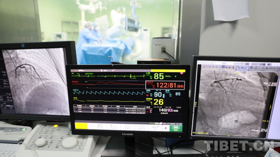圖為陰赪茜(手術(shù)室內(nèi)右)趕赴阿壩州人民醫(yī)院手術(shù)救治急性心?;颊?,通過(guò)比對(duì)屏幕上的畫面,術(shù)后(左側(cè)屏幕)患者的心臟血管血流已較術(shù)前明顯恢復(fù) 攝影:劉莉
