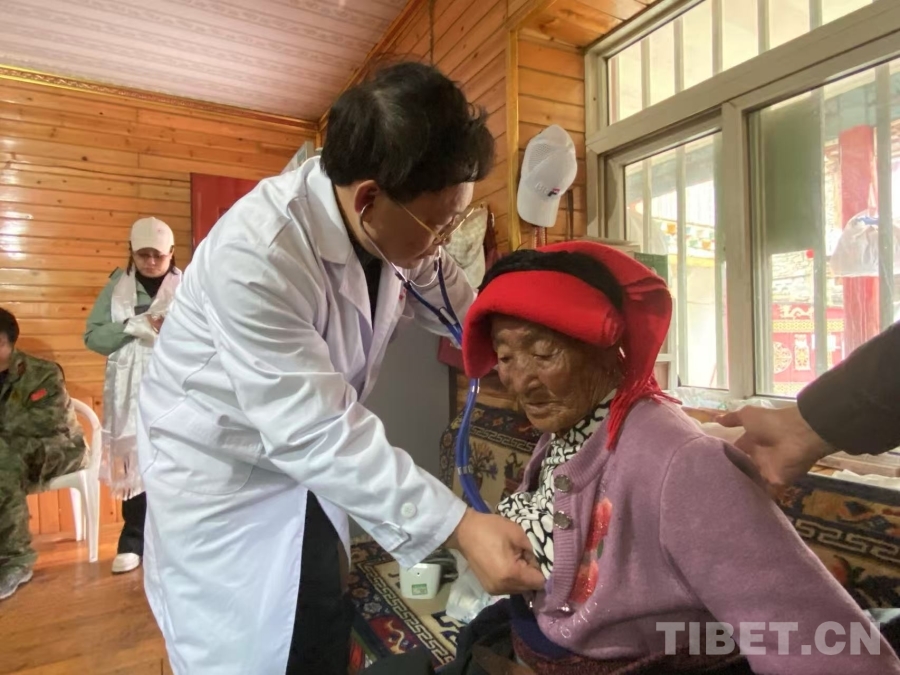 圖為“同心·共鑄中國(guó)心”醫(yī)務(wù)志愿者、廣東省中醫(yī)院心血管病??浦魅吾t(yī)師陳伯鈞為藏族阿媽查體