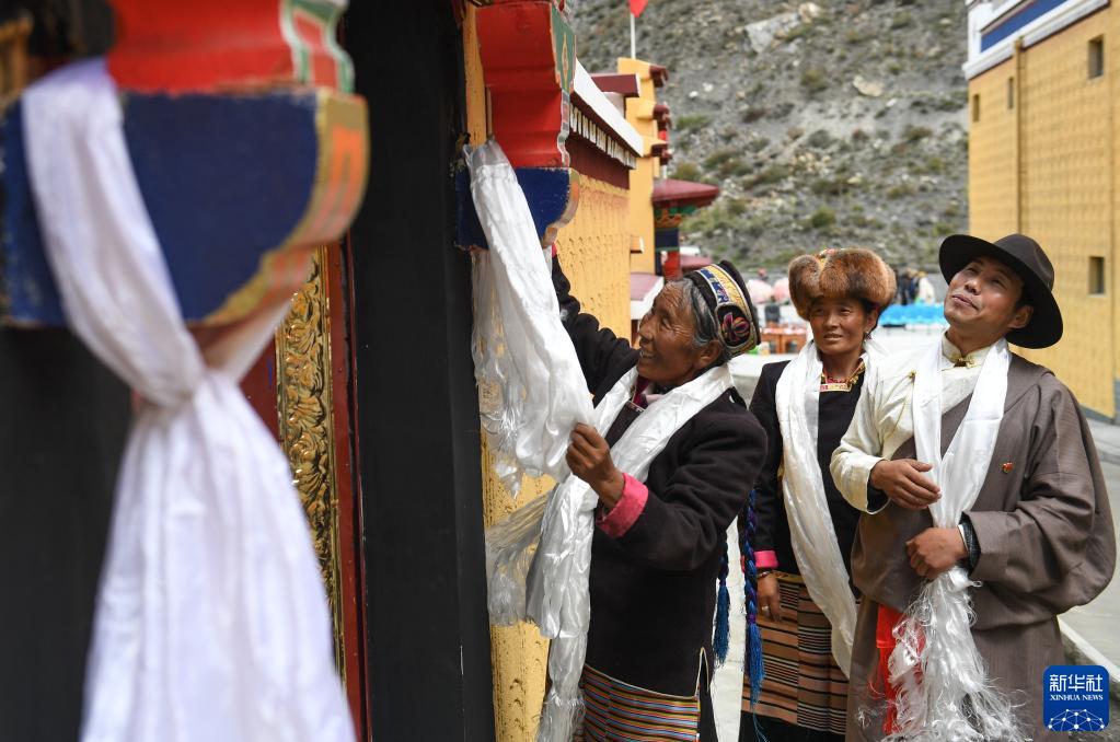 西藏山南市洛扎縣洛扎鎮(zhèn)居民旦增曲珍(左)給新房獻(xiàn)哈達(dá)(2019年9月21日攝)。新華社記者 晉美多吉 攝
