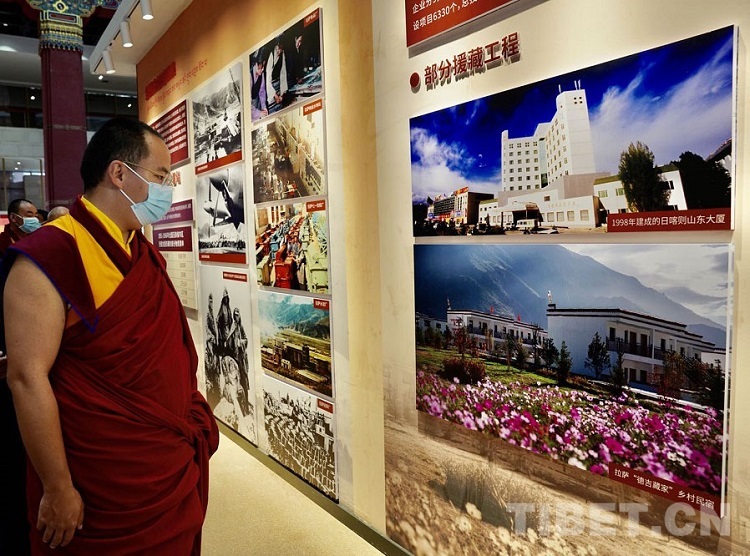《十七條協(xié)議》簽訂、西藏自治區(qū)第一次人民代表大會召開、習(xí)近平總書記來信、對口援藏資金圖表……一幅幅圖片、一份份史料將西藏和平解放70年來,西藏從黑暗走向光明、從落后走向進(jìn)步、從貧窮走向富裕、從專制走向民主、從封閉走向開放的歷史生動地呈現(xiàn)出來。班禪不時(shí)駐足觀看,詳細(xì)詢問有關(guān)情況,對西藏近年來各項(xiàng)事業(yè)取得的成就予以充分肯定。