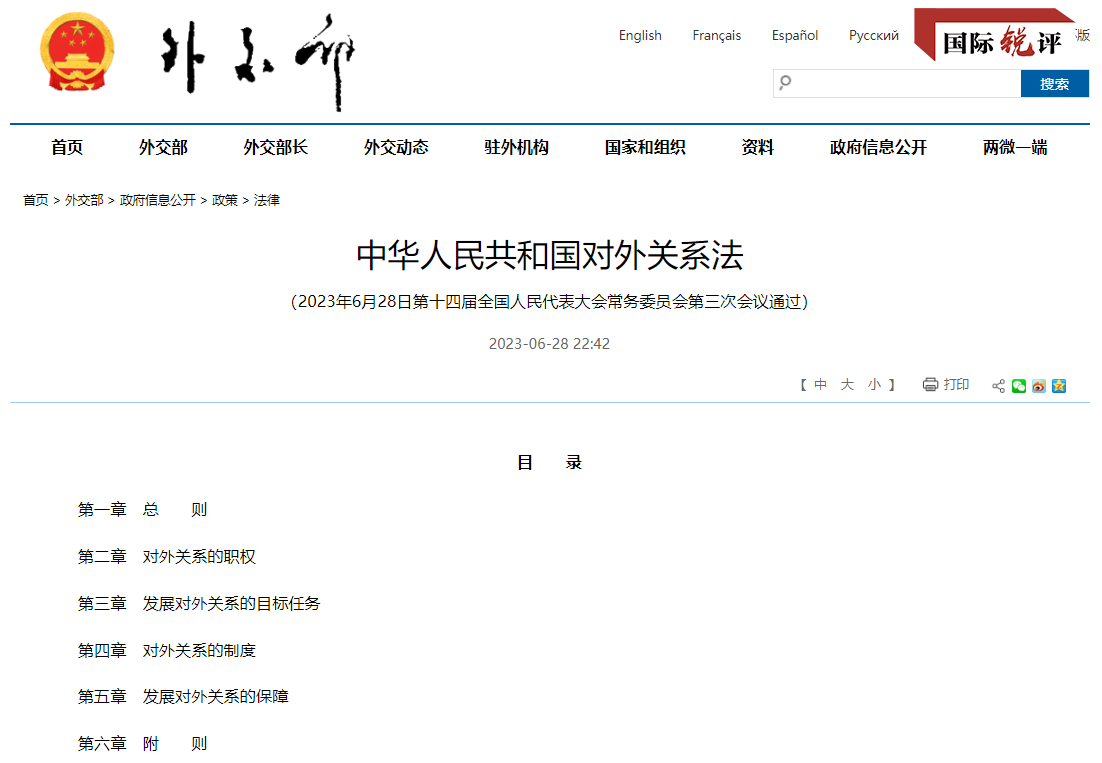 從7月1日起,《中華人民共和國(guó)對(duì)外關(guān)系法》正式施行。這是新中國(guó)首部基礎(chǔ)性、綱領(lǐng)性、綜合性對(duì)外關(guān)系法律,為中國(guó)與世界交往提供了更完善的法律遵循。它將讓世界更好地了解中國(guó),了解中國(guó)推動(dòng)構(gòu)建人類(lèi)命運(yùn)共同體的堅(jiān)定信念,了解中國(guó)維護(hù)國(guó)家主權(quán)、安全和發(fā)展利益以及國(guó)際公平正義的決心和擔(dān)當(dāng)。新加坡《聯(lián)合早報(bào)》引述專(zhuān)家的話評(píng)價(jià)說(shuō),這部法律展現(xiàn)了中國(guó)外交政策原則,將中國(guó)執(zhí)政黨領(lǐng)導(dǎo)外交事務(wù)的論述以法律形式進(jìn)行了確立。