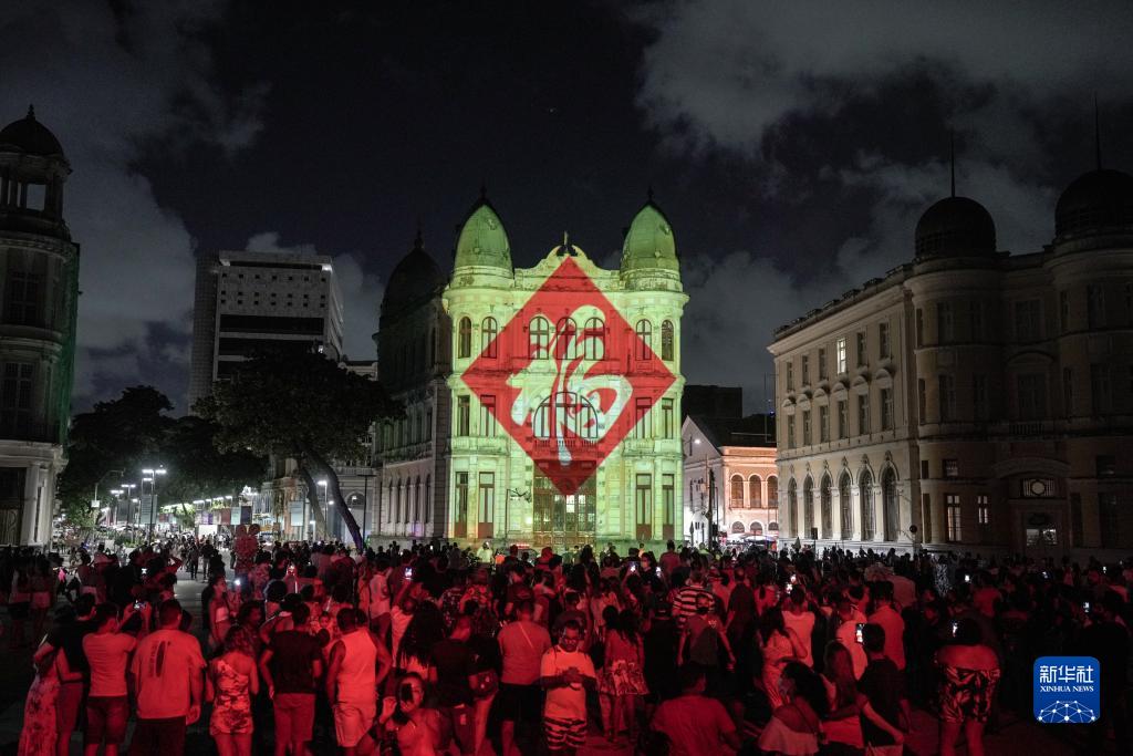 1月30日,人們在巴西累西腓觀看“慶新春、迎冬奧”燈光秀。新華社記者 王天聰 攝