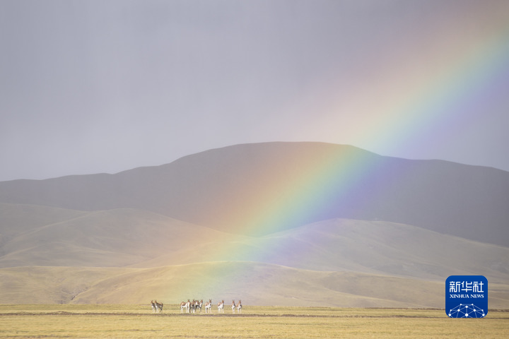 彩虹下的羌塘國家級自然保護(hù)區(qū)藏野驢。新華社記者 孫瑞博 攝