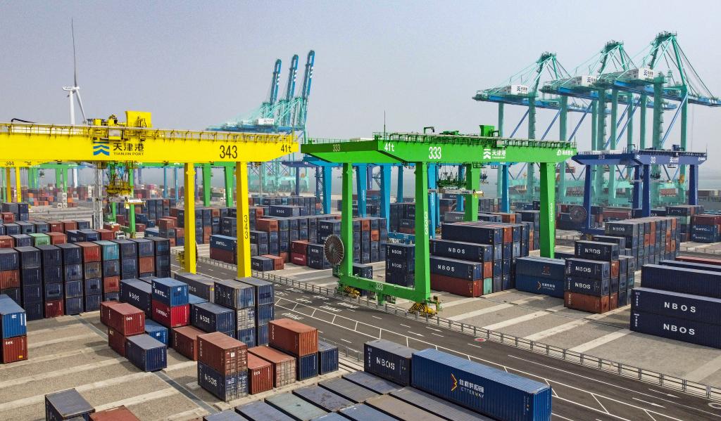 這是4月9日拍攝的天津港北疆港區(qū)C段智能化集裝箱碼頭(無人機照片)。新華社記者趙子碩攝