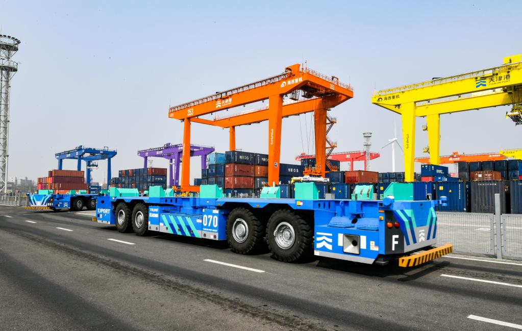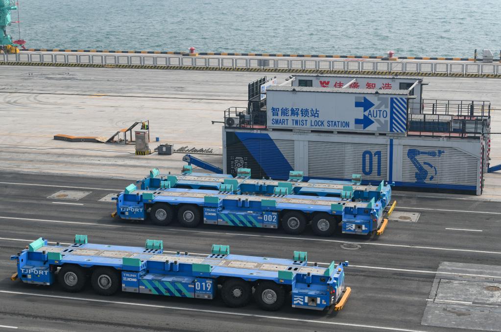 4月9日,這是在天津港北疆港區(qū)C段智能化集裝箱碼頭拍攝的智能水平運輸機器人和智能解鎖站。新華社記者孫凡越攝