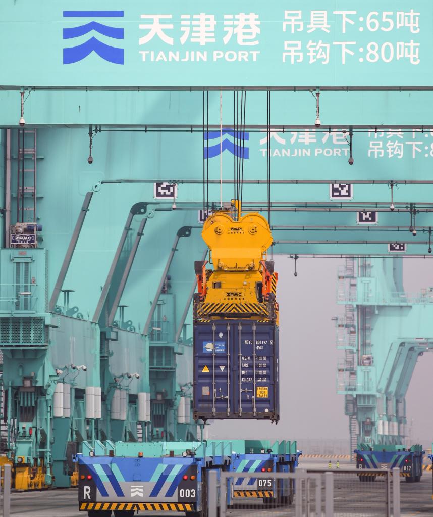 4月9日,在天津港北疆港區(qū)C段智能化集裝箱碼頭,岸橋在進行集裝箱裝卸作業(yè)。新華社記者孫凡越攝