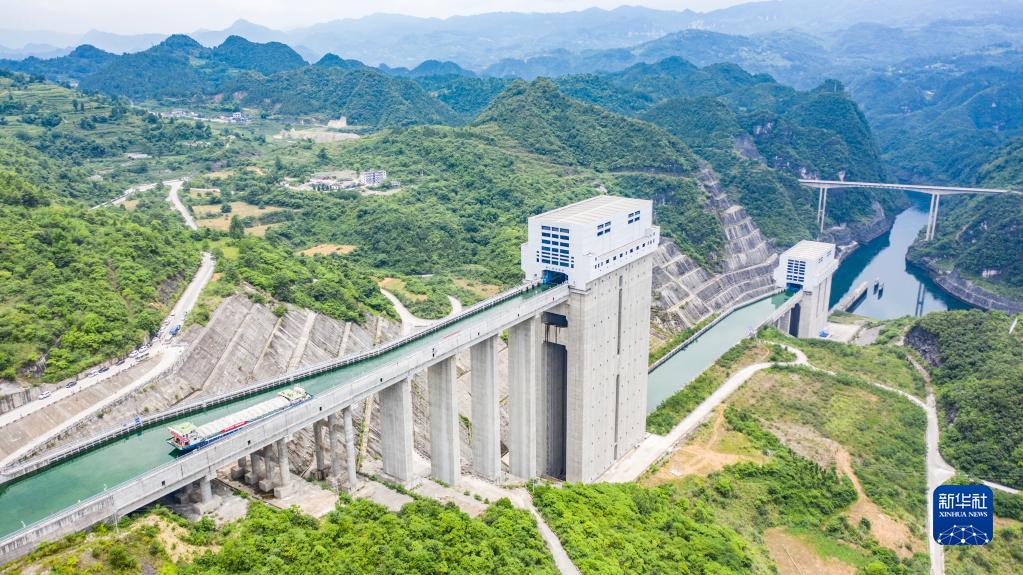 2021年6月投入試運行的構(gòu)皮灘水電站配套的通航工程,被視為貴州通江達海的關(guān)鍵。構(gòu)皮灘通航水頭高差達199米,采用三級垂直升船機運行,船只通過烏江構(gòu)皮灘水電站都要搭乘“水上電梯”,呈現(xiàn)出“水在空中懸,船在天上行”的奇景。