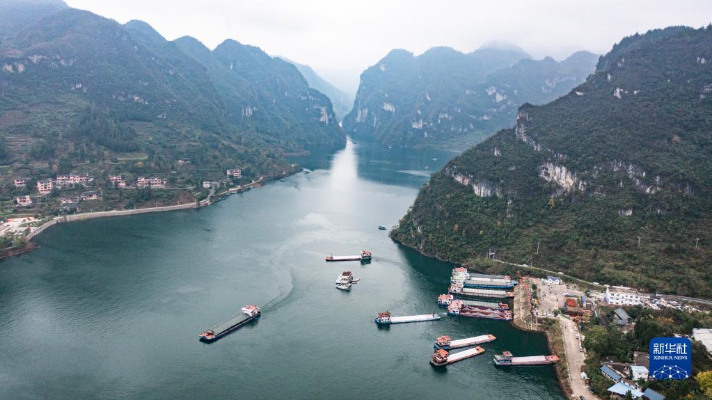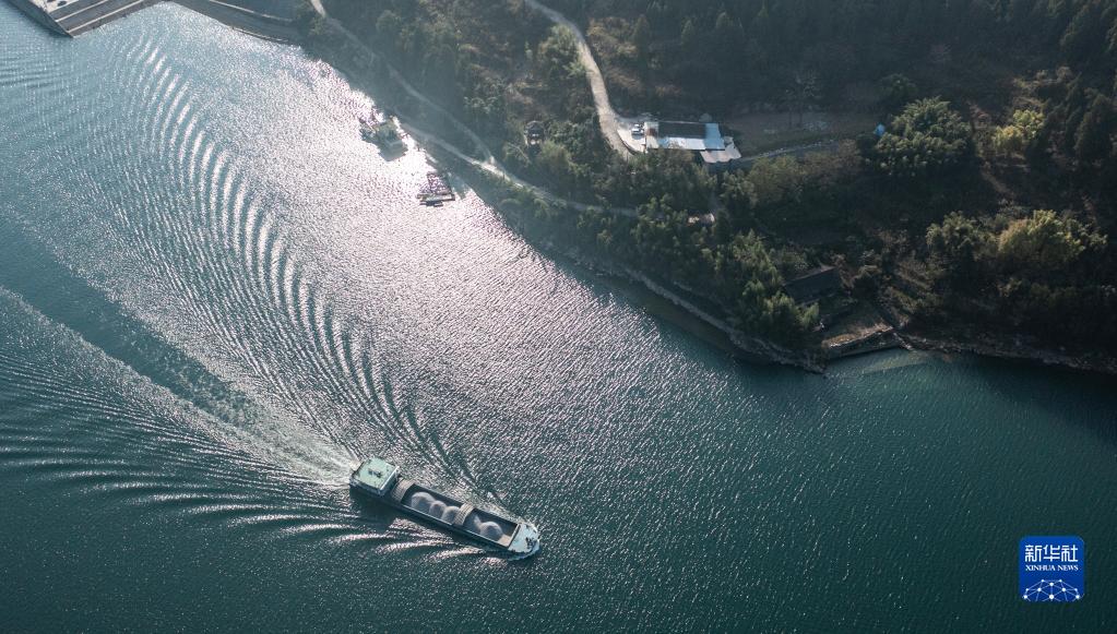 運載磷礦石的貨船沿烏江航道順流航行(2021年11月18日攝,無人機照片)。新華社記者 陶亮 攝