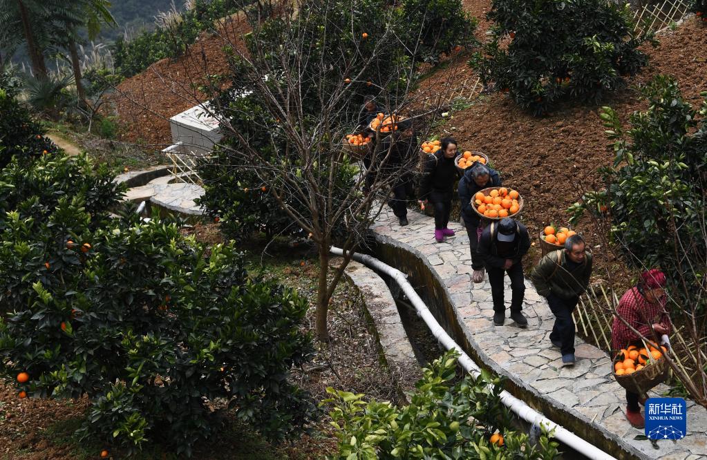 毛相林(右二)和下莊村村民在背運(yùn)剛采摘的柑橘(2021年1月7日攝)。新華社記者 王全超 攝