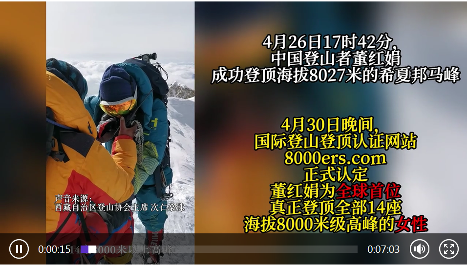 4月26日17時(shí)42分,中國登山者董紅娟成功登頂海拔8027米的希夏邦馬峰。30日晚間,國際登山登頂認(rèn)證網(wǎng)站8000ers.com正式認(rèn)定董紅娟為全球首位登頂全部14座海拔8000米級(jí)高峰的女性。