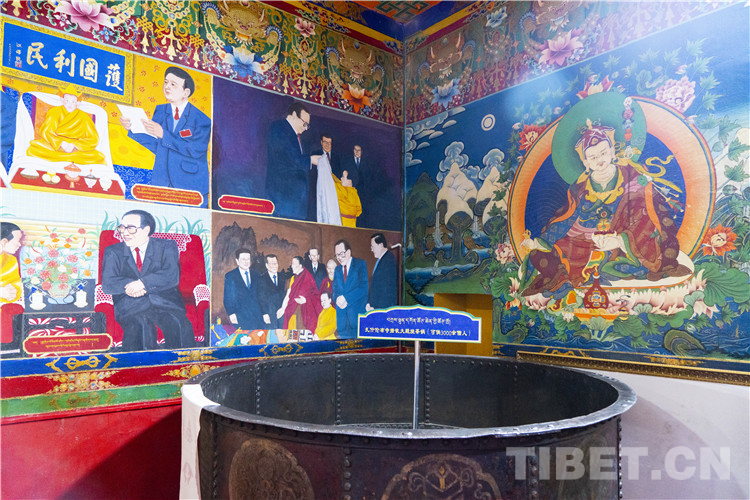 與寺廟內(nèi)傳統(tǒng)的佛教題材壁畫不同,在什倫布寺民族團(tuán)結(jié)和愛國主義教育基地展廳北側(cè),繪制著十世班禪額爾德尼·確吉堅贊與歷代黨和國家領(lǐng)導(dǎo)人重要的會面時刻以及十一世班禪額爾德尼·確吉杰布金瓶掣簽的整個過程。