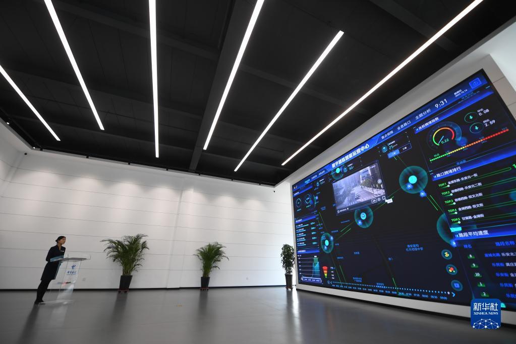 10月16日,河北雄安新區(qū)中國(guó)電信智慧城市產(chǎn)業(yè)園工作人員展示數(shù)字道路運(yùn)營(yíng)系統(tǒng)。新華社記者 朱旭東 攝