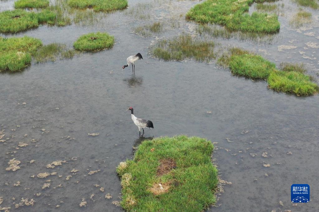 這是在甘肅省甘南藏族自治州碌曲縣尕海湖拍攝的國家一級保護(hù)動物黑頸鶴及其幼鳥(無人機(jī)照片,2021年6月2日攝)。新華社記者 杜哲宇 攝