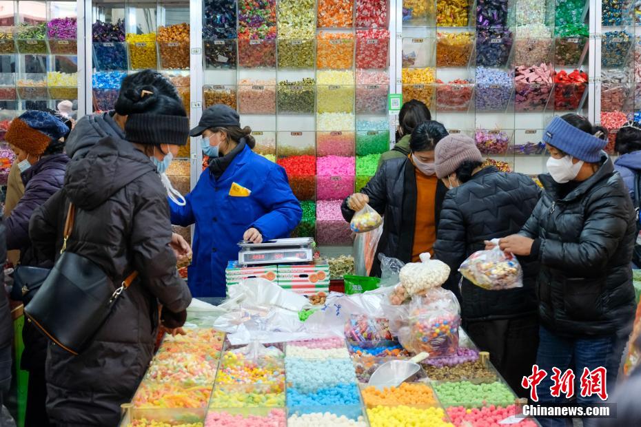 目前正值藏歷12月下旬,西藏即將迎來(lái)傳統(tǒng)藏歷水虎新年,拉薩民眾也全面進(jìn)入“藏歷新年時(shí)間”。2月27日下午,小新在西藏最大的傳統(tǒng)綜合市場(chǎng)——拉薩沖賽康市場(chǎng)周邊看到,羅薩美朵、卡塞、酥油、切瑪盒、糖果、干果、藏式服裝等年貨琳瑯滿(mǎn)目,購(gòu)買(mǎi)的市民也進(jìn)入“最后”的采購(gòu)時(shí)間,市場(chǎng)周?chē)巳航j(luò)繹不絕,高原迎春、年味十足。圖為一商販在拉薩沖賽康市場(chǎng)周邊銷(xiāo)售藏歷新年年貨“褪”。江飛波 攝