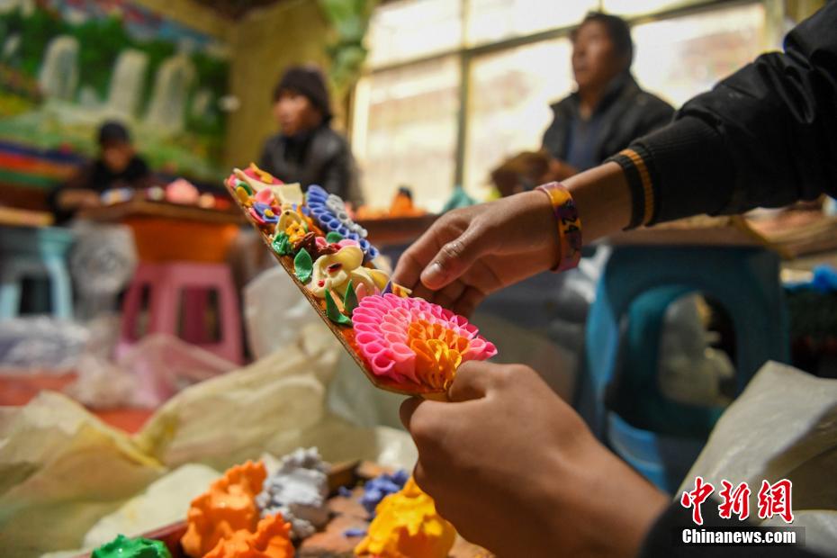 酥油花是古代藏傳佛教信眾因冬季沒(méi)有鮮花供佛而發(fā)明的替代品,如今已演變成藏歷新年年貨。貢嘎來(lái)松 攝