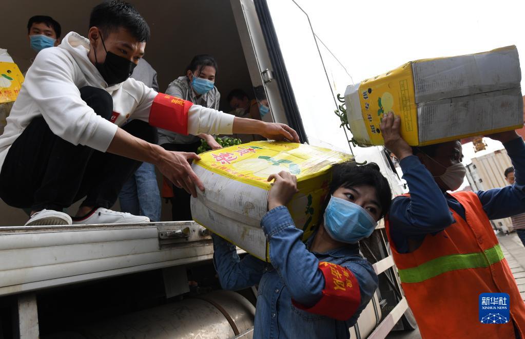 2020年3月3日,在廣西南寧國際鐵路港,南寧車務(wù)段“青年突擊隊”隊員黃瑩瑩(右二)在搬運廣西馳援湖北物資。新華社記者 陸波岸 攝