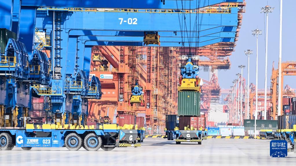 在廣西欽州港自動(dòng)化集裝箱碼頭,無(wú)人駕駛車(chē)輛在轉(zhuǎn)運(yùn)集裝箱(2023年2月25日攝)。新華社記者 張愛(ài)林 攝