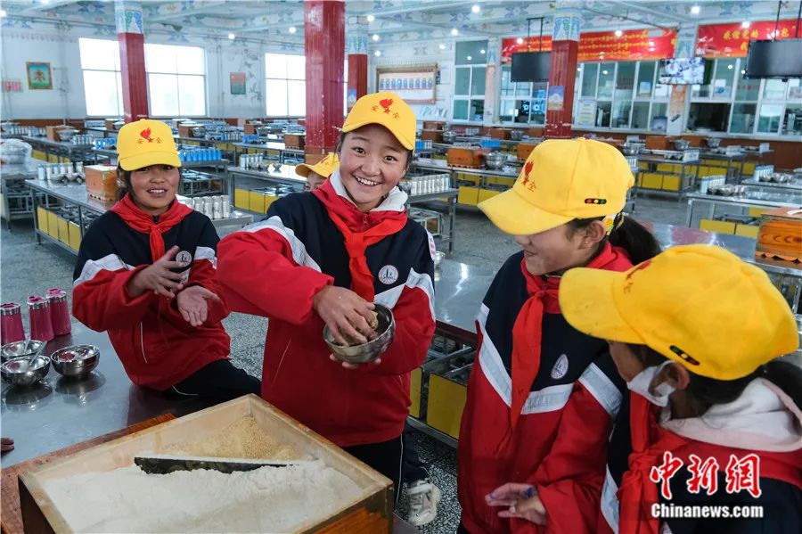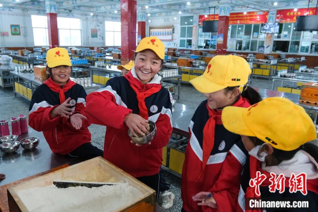 2023年10月13日,班戈縣中石化小學六年級一班尼瑪拉增(左二)在學校食堂捏糌粑,孩子們說她們的早餐便是以糌粑為主。該校四至六年級多是寄宿制住校生。江飛波 攝