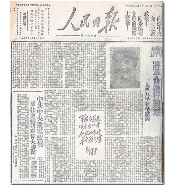圖為1949年1月1日《人民日報》第1版刊登的新華社社論《將革命進行到底——一九四九年新年獻詞》。圖片來源:中國軍網(wǎng)