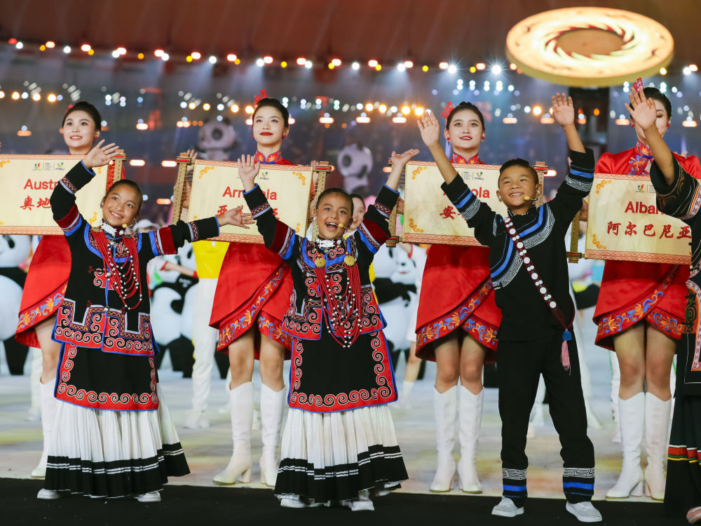 7月28日,來(lái)自四川涼山彝族自治州的孩子們?cè)诔啥即筮\(yùn)會(huì)開(kāi)幕式上歌唱。新華社記者 陳澤國(guó) 攝