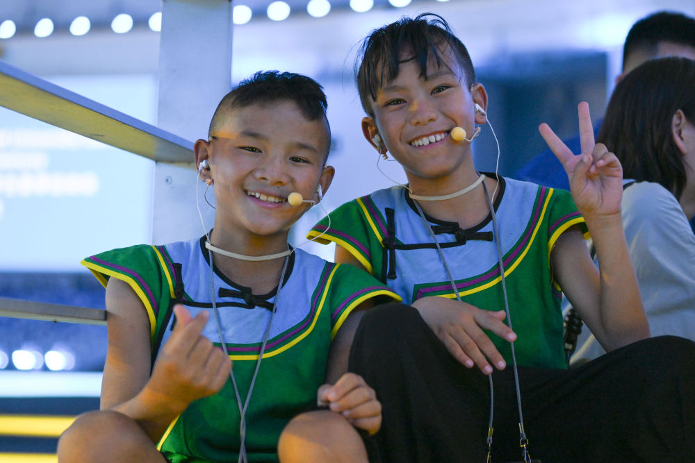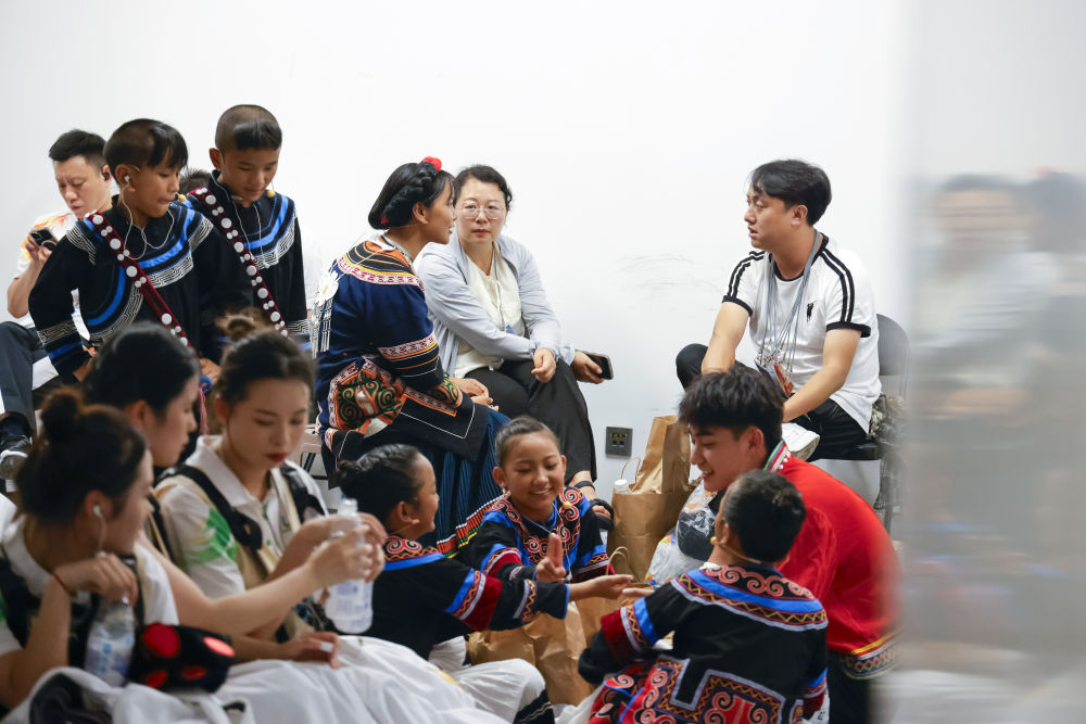 7月16日,在成都大運(yùn)會(huì)開(kāi)幕式彩排現(xiàn)場(chǎng)拍攝的候場(chǎng)中的吉子醫(yī)生(左)和吉朵史拉(右)。新華社記者胥冰潔 攝
