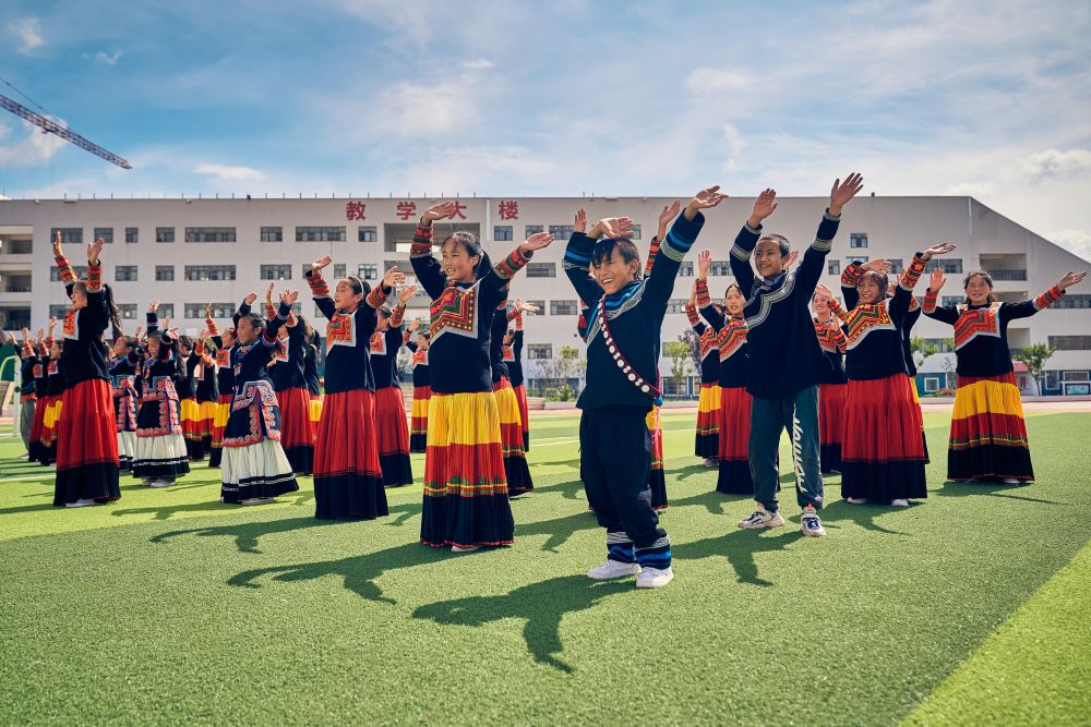 7月2日,在昭覺(jué)縣萬(wàn)達(dá)融創(chuàng)紅絲帶愛(ài)心學(xué)校參與排練的俄地惹漢(前左)、馬杰英(前中)和吉合拉作(前右)。(受訪(fǎng)者供圖)