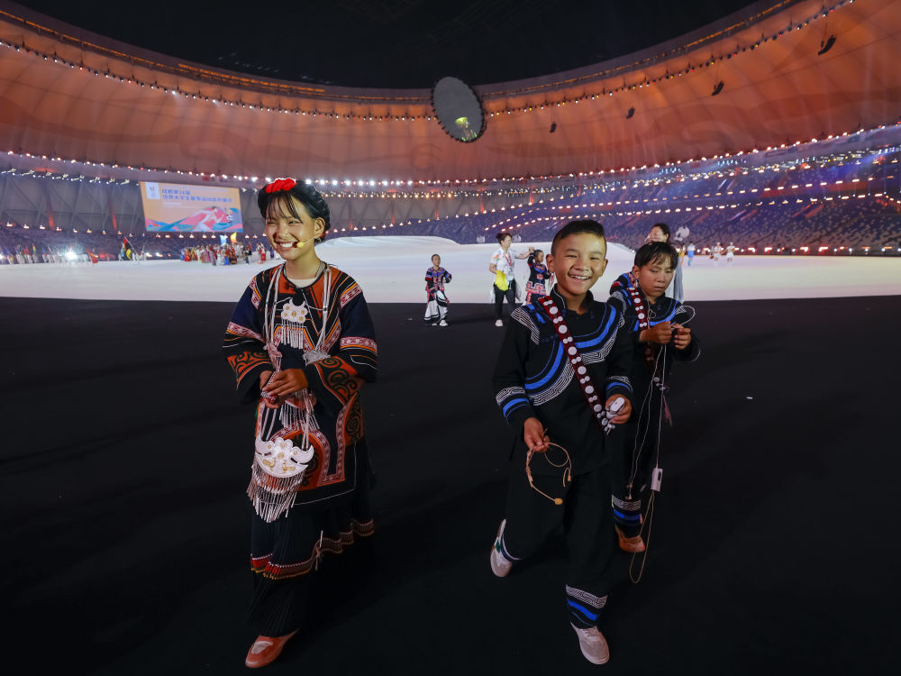 7月23日,在成都大運(yùn)會(huì)開(kāi)幕式彩排結(jié)束后,吉好有果(前左)與其他孩子準(zhǔn)備離開(kāi)彩排現(xiàn)場(chǎng)。新華社記者沈伯韓 攝