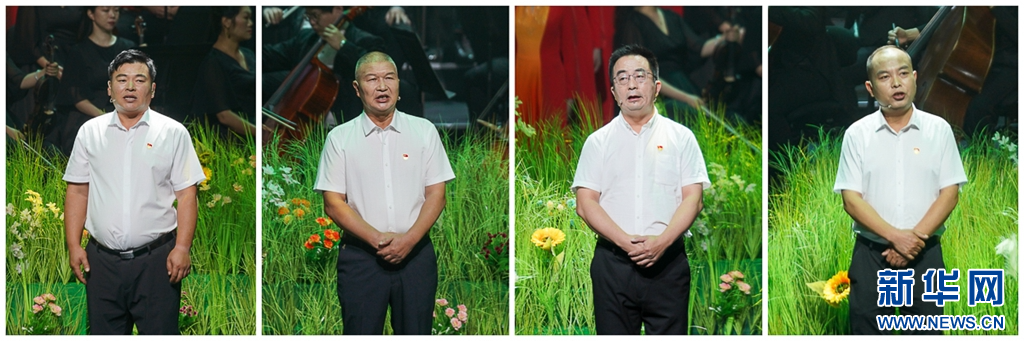 7月17日晚上,來(lái)自基層的村干部鞏保雄(左一)、高泉偉(左二)、俞小平(右二)和施金通(右一)走上舞臺(tái),深情講述《新時(shí)代——我做鄉(xiāng)村振興答卷人》。新華網(wǎng) 肖和勇 攝