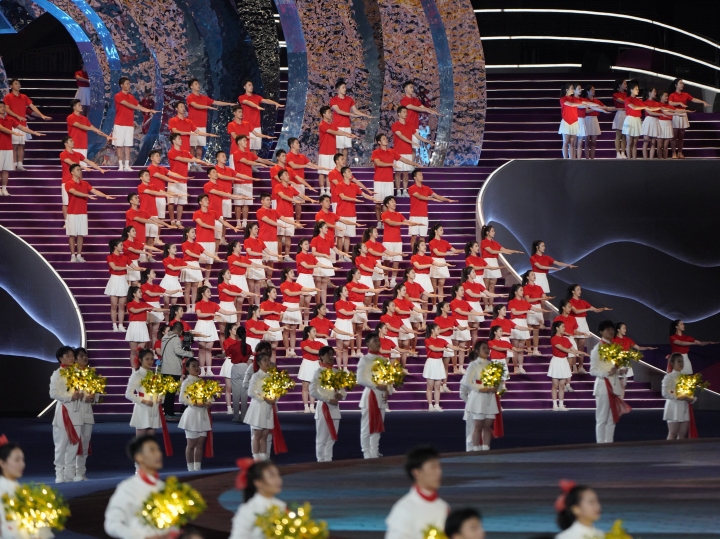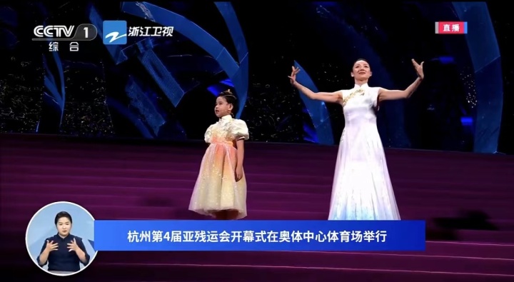 10月22日杭州亞殘運(yùn)會開幕式上,表演者用手語“唱”國歌。潮新聞?dòng)浾?楊朝波 攝