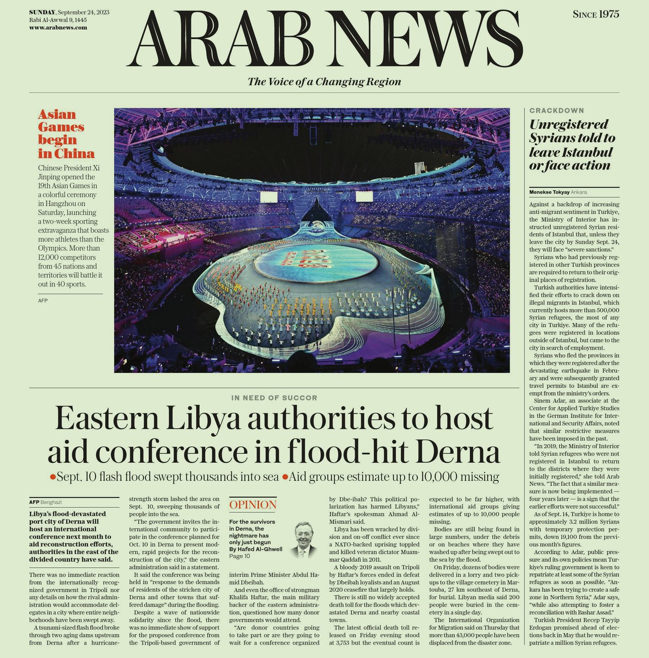 沙特阿拉伯24日出版的《阿拉伯新聞報(bào)》(Arab News)以頭版圖文的方式呈現(xiàn)亞運(yùn)會(huì)開幕盛況,用了“五彩斑斕”來形容這一場開幕式,并介紹本屆亞運(yùn)會(huì)的運(yùn)動(dòng)員人數(shù)甚至超過了奧運(yùn)會(huì),來自45個(gè)國家和地區(qū)超過12000名運(yùn)動(dòng)員將在40個(gè)運(yùn)動(dòng)大項(xiàng)中展開角逐。