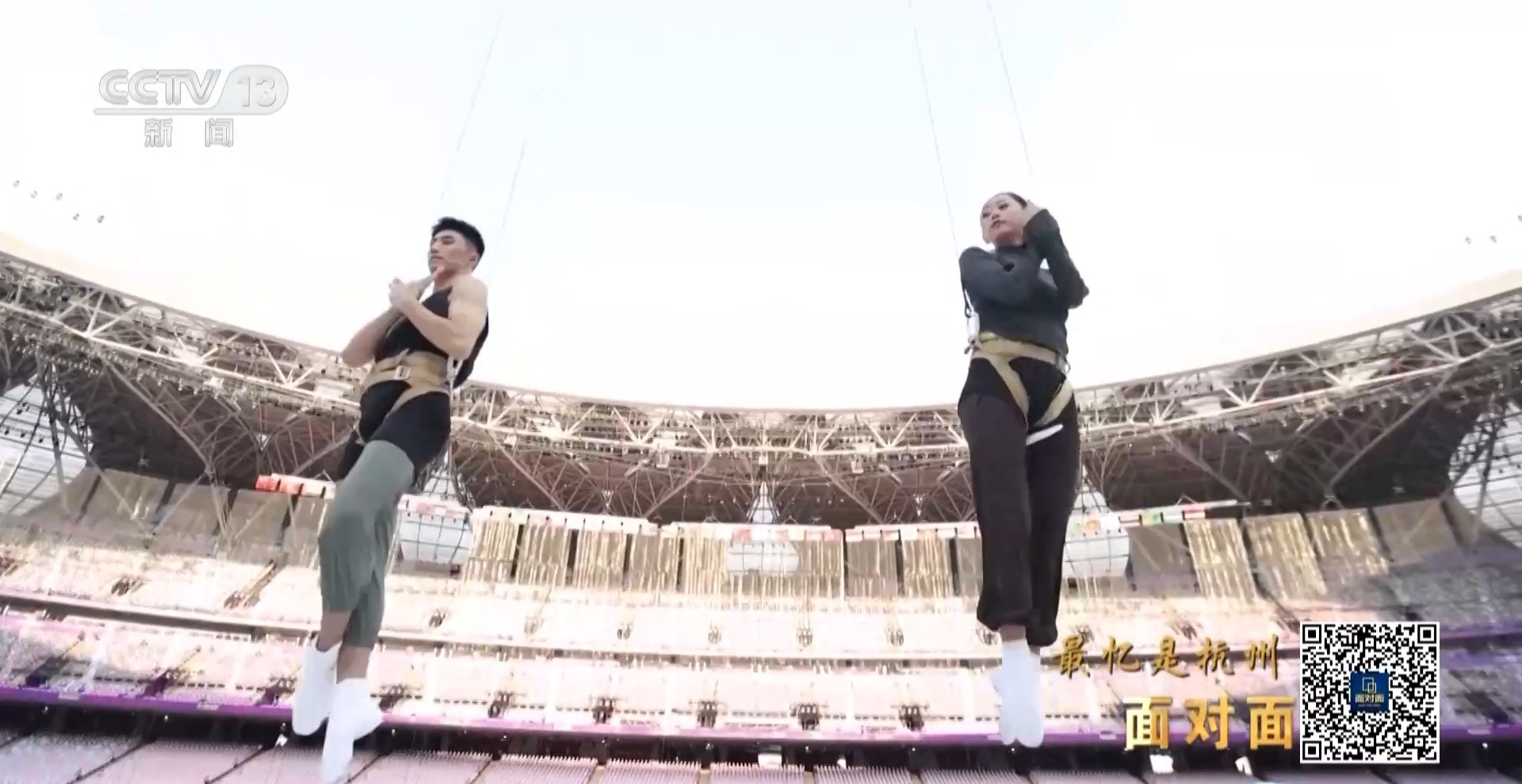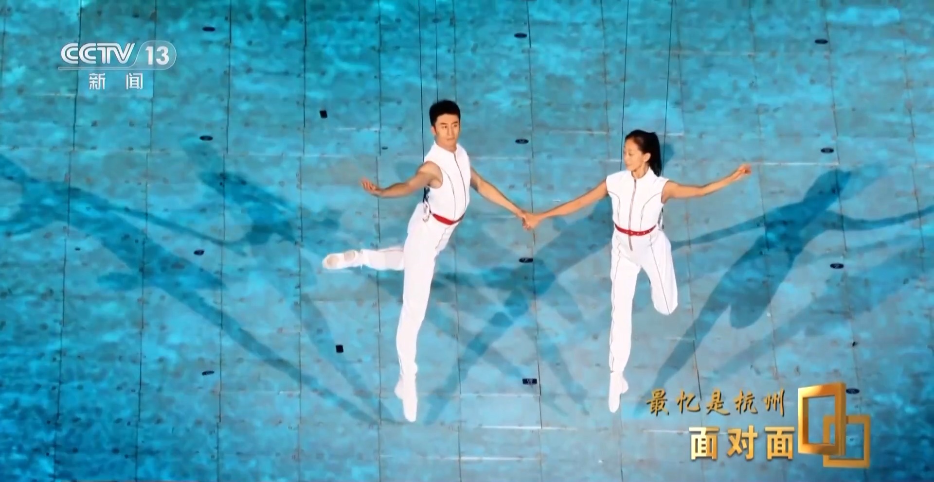 這是《錢塘潮涌》篇章中的雙人3D威亞節(jié)目,展現(xiàn)了勇立潮頭的波瀾壯闊場景,這也是世界上首次在大型運動場空間中使用雙3D威亞技術(shù)。