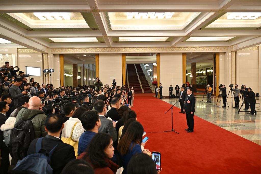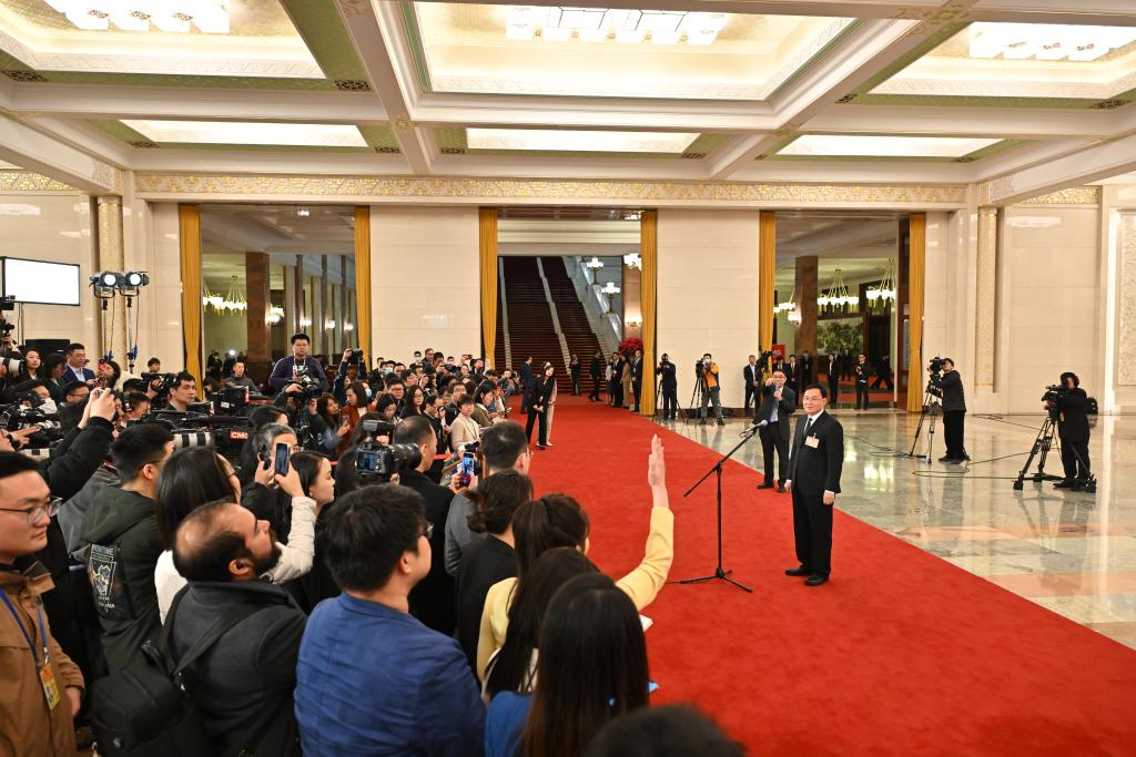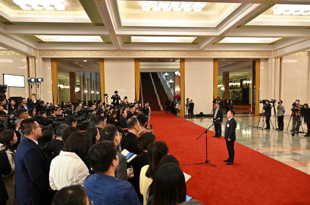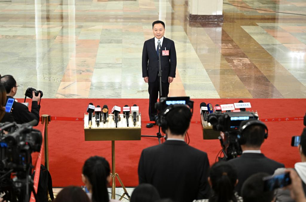 3月5日,第十四屆全國人民代表大會第二次會議首場“部長通道”集中采訪活動在北京人民大會堂舉行。這是水利部部長李國英接受媒體采訪。新華社記者 牟宇 攝