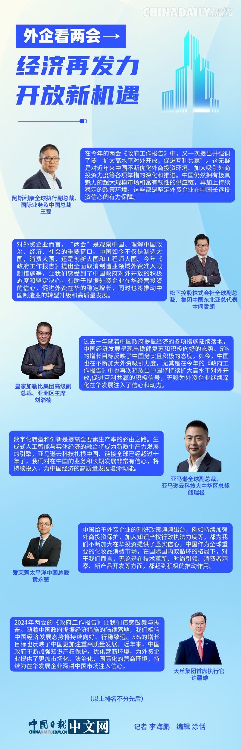 “中國(guó)是贏得未來的重要引擎”、“5%的經(jīng)濟(jì)增長(zhǎng)目標(biāo)反映了中國(guó)理性務(wù)實(shí)的發(fā)展態(tài)度,同時(shí)也反映了中國(guó)更加注重高質(zhì)量發(fā)展”、 “《政府工作報(bào)告》中再次釋放出中國(guó)將持續(xù)擴(kuò)大高水平對(duì)外開放、促進(jìn)互利共贏的積極信號(hào),為外資企業(yè)繼續(xù)深化在華發(fā)展注入了信心和動(dòng)力”、“與中國(guó)‘脫鉤’是不現(xiàn)實(shí)的,在經(jīng)濟(jì)全球化時(shí)代,各國(guó)深化合作才能讓經(jīng)濟(jì)可持續(xù)發(fā)展”……眾多外企紛紛表示,中國(guó)經(jīng)濟(jì)的穩(wěn)定發(fā)展將會(huì)繼續(xù)為外資企業(yè)提供廣闊的空間和豐富的機(jī)遇,于此同時(shí),他們也將持續(xù)投入、加碼中國(guó)市場(chǎng),為中國(guó)經(jīng)濟(jì)高質(zhì)量發(fā)展提供動(dòng)力。