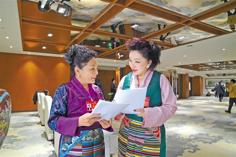 3月5日,全國政協(xié)十四屆二次會議分界別討論政協(xié)常委會工作報告和提案工作情況報告,住藏全國政協(xié)委員緊緊圍繞兩個報告,結(jié)合西藏政協(xié)工作實(shí)際,在小組討論中積極履職建言。圖為住藏全國政協(xié)委員卓嘎(左)和朗杰拉措(右)在會議結(jié)束后討論交流。