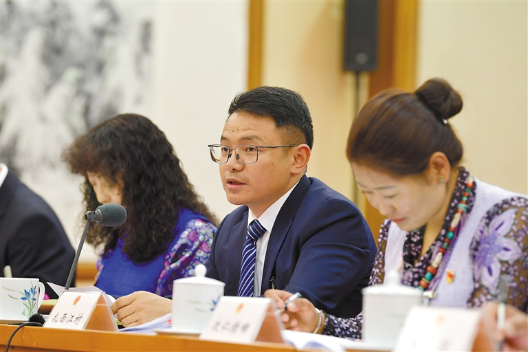 3月5日下午,十四屆全國人大二次會議西藏代表團(tuán)舉行全體會議,審議政府工作報告。圖為來自隆子縣斗玉珞巴民族鄉(xiāng)的全國人大代表扎西江村在西藏代表團(tuán)審議時發(fā)言。記者 旦增西旦 攝